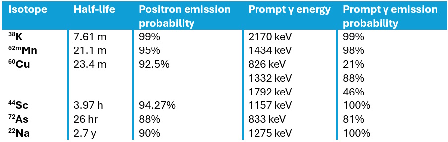 To achieve this separation, mPET exploits positron-gamma emitters such as 124I, for instance, which in addition to emitting positrons, emit an additional prompt gamma photon following the positron decay. Such isotopes decay to an excited state of the daughter nucleus, followed by near-instantaneous emission of a de-excitation gamma photon. This additional photon enables the detection of triple coincidence events, providing more biological information in a single scan.