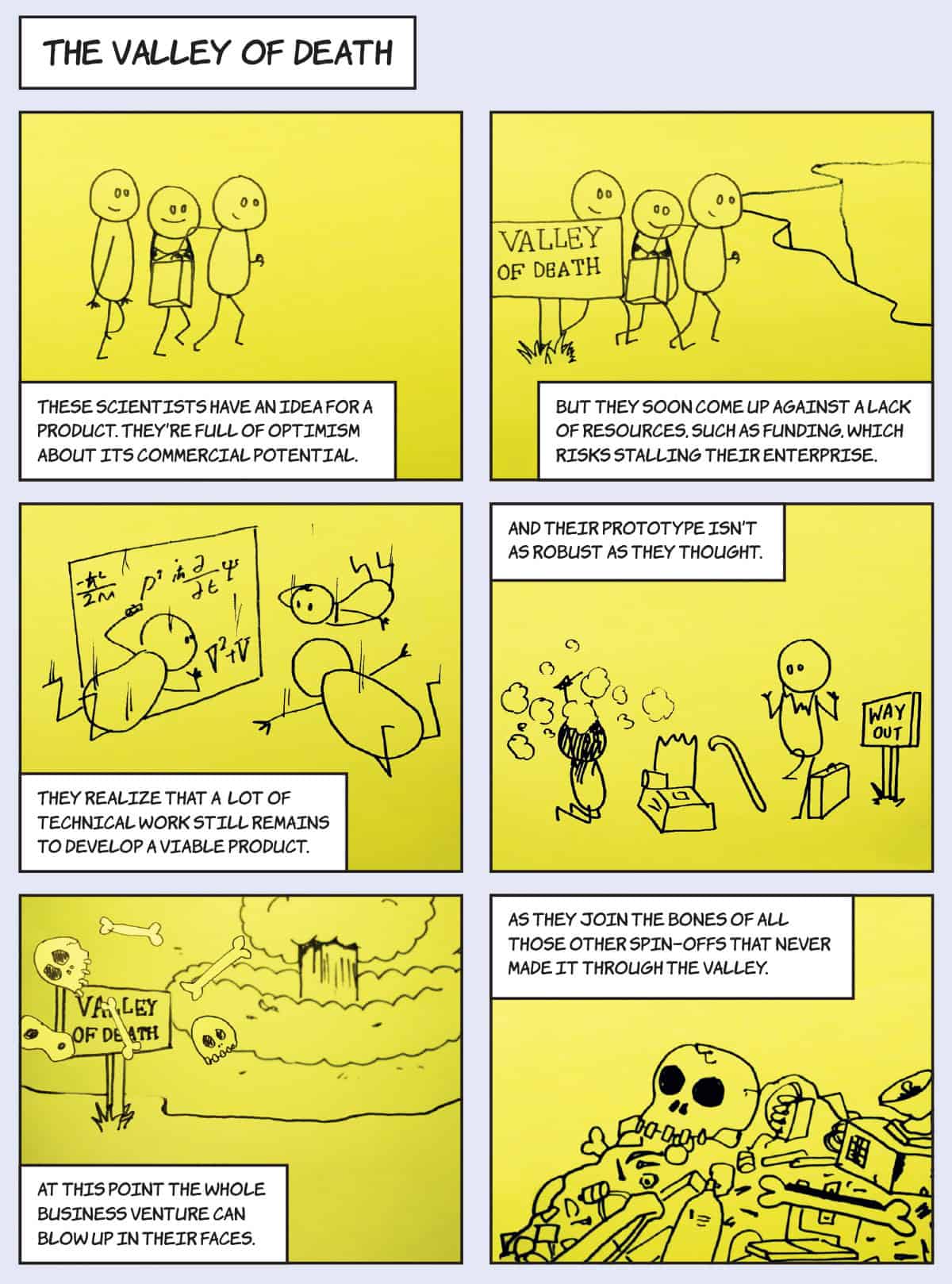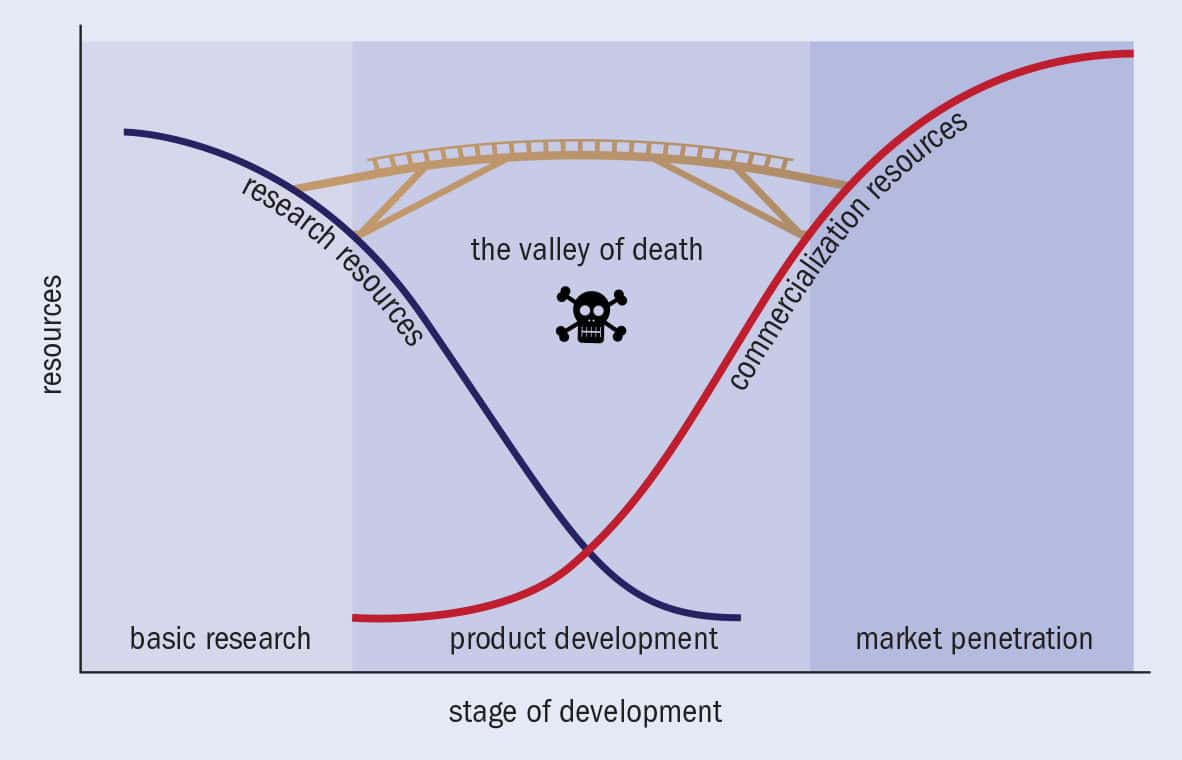 Scientists translating an innovation from the lab to the marketplace often find themselves caught in limbo once their research funding has dried up but they are not yet making any money from their product. Known as the valley of death, this stage is where start-ups often fail unless extra investment can be found to bridge the gap in resources.