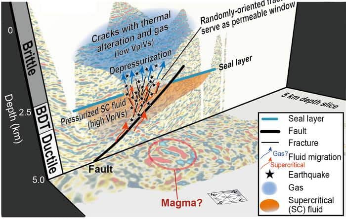 In their study, Tsuji and colleagues focused on a region known as the brittle-ductile transition zone, which is where rocks go from being seismically active to mostly inactive. This zone is important for understanding volcanic activity and geothermal processes because it lies near an impermeable sealing band that allows fluids such as water to accumulate in a high-pressure, supercritical state. When these fluids undergo phase transitions, earthquakes may follow. However, such fluids could also produce more geothermal energy than conventional systems. Identifying their location is therefore important for this reason, too.