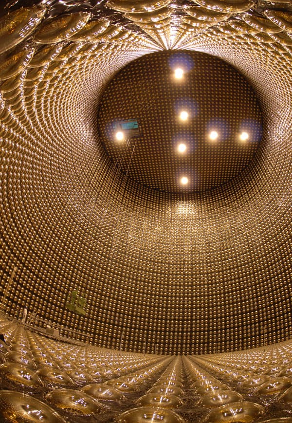 According to the original Standard Model, these three neutrinos were supposed to be massless, but that criterion soon began to crumble. In 1968 a team led by Ray Davis at the Brookhaven National Laboratory in the US found that it could detect only about a third of the electron neutrinos predicted to be arriving at its detector from fusion processes in the Sun, a result that was confirmed 20 years later by the Kamiokande experiment in Japan. Then, in 1998, a larger version of Kamiokande called SuperKamiokande, or SuperK, confirmed another strange result, this time about neutrinos generated in the atmosphere by cosmic rays. Theoretical models had predicted that there ought to be twice as many muon neutrinos generated by cosmic rays as electron neutrinos – but the researchers found roughly equal numbers of each.