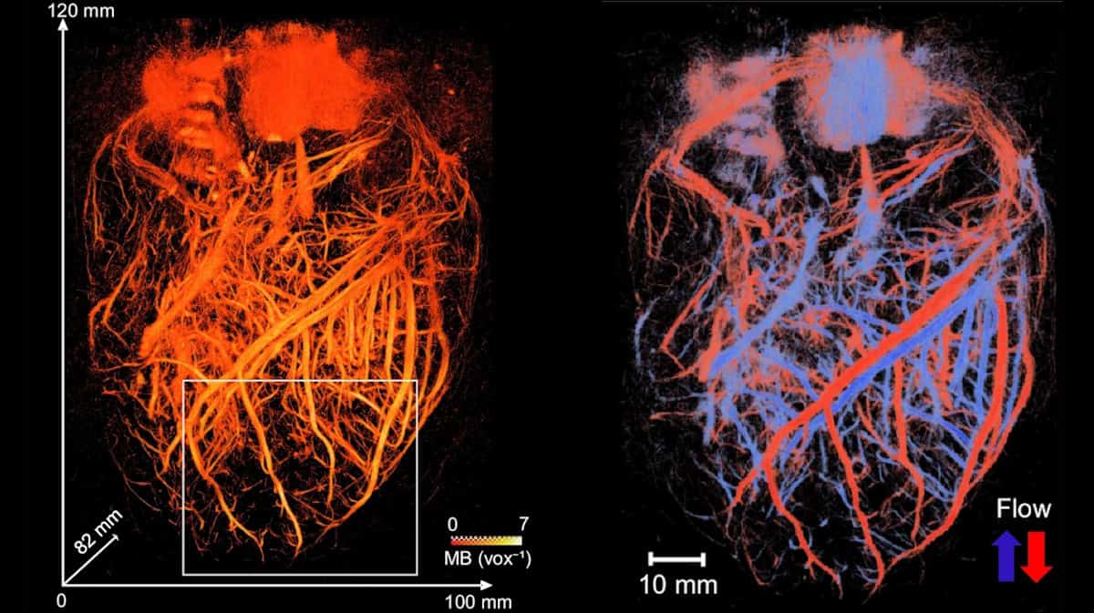 The heart was perfused with microbubble solution, enabling the probe to visualize the whole coronary microcirculation network over a large volume of 120 x 100 x 82 mm, with a spatial resolution of around 125 µm. The technique enabled visualization of both large vessels and the finest microcirculation in real time. The team also used a skeletonization algorithm to measure vessel radii at each voxel, which ranged from approximately 75 to 600 µm.