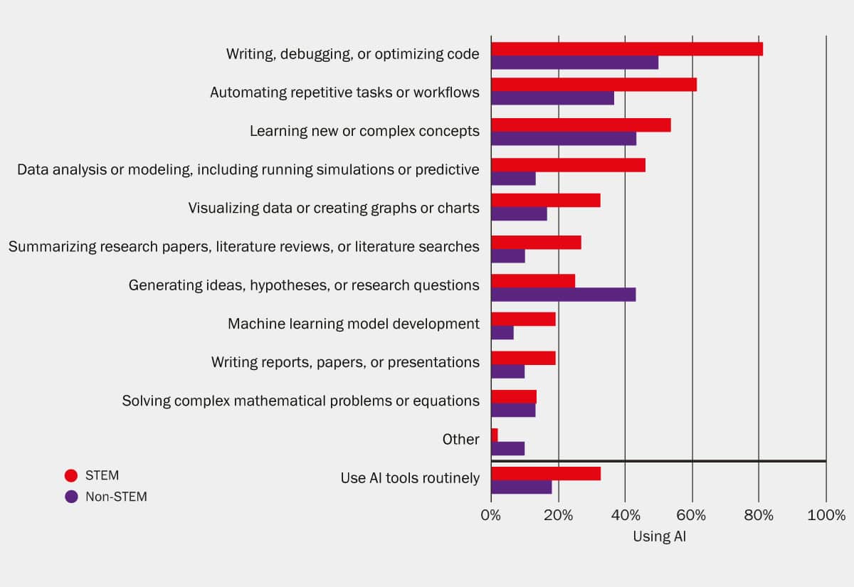 The “AI Use Among Physics Degree Recipients” report by the American Institute of Physics, published in August 2025, shows how recent physics degree recipients are engaging with AI, encompassing both its development and its application in daily professional activities. New bachelor’s graduates working in both STEM and non-STEM roles who received their degrees between 2023 and 2024 answered whether they routinely used AI tools in their day-to-day work in February 2025.